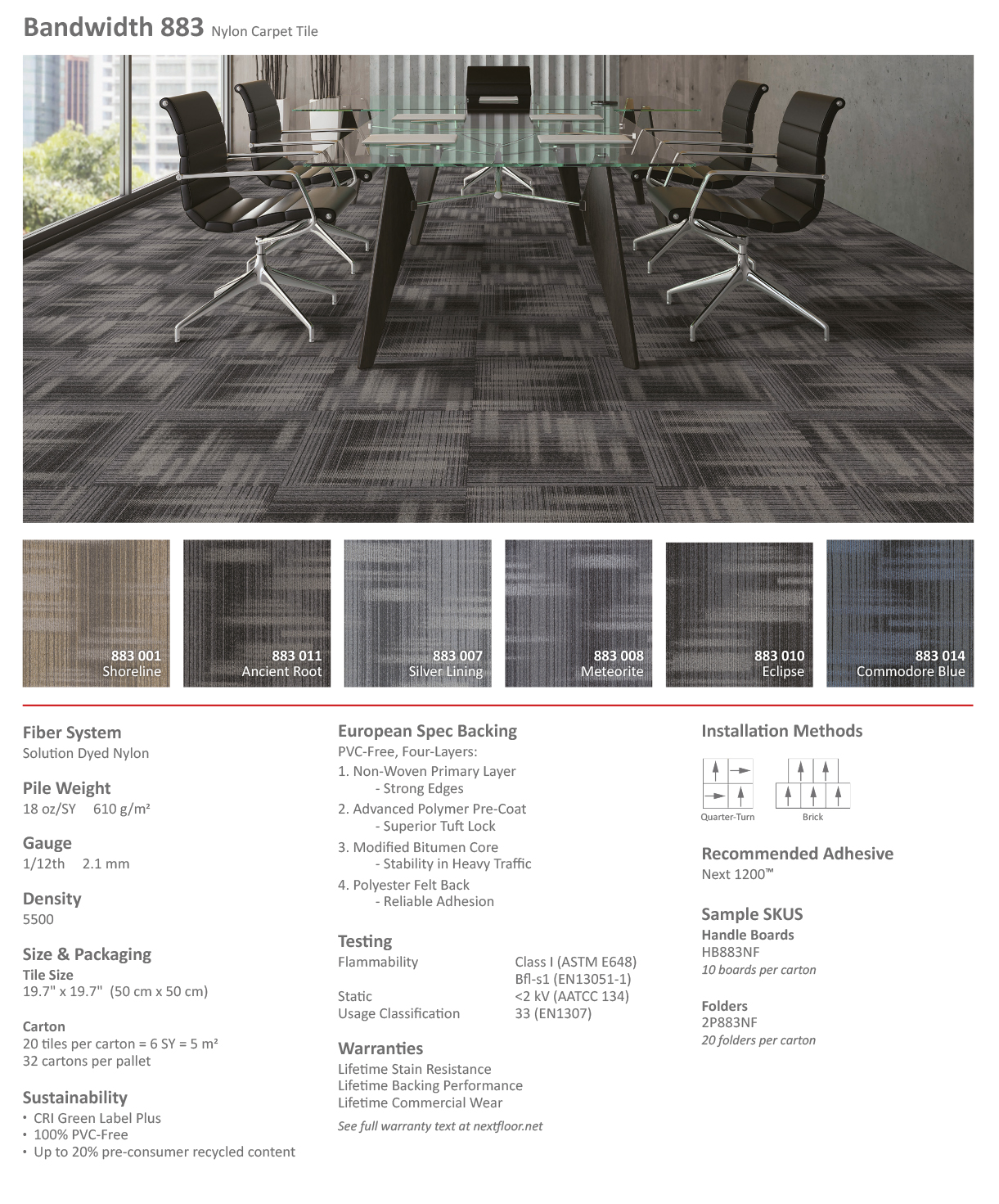 Next Floor Bandwidth 883 Commodore Blue commercial carpet tile comes in 19.7″ x 19.7″ carpet squares with a PVC-free backing. The fiber system consists of solution dyed nylon that is 1/12th inch in gauge. Not only is it 100% PVC-free, CRI Green Label Plus and made of up to 20% pre consumer recycled content, but it also comes with a lifetime commercial warranty regarding stain resistance, backing performance, and commercial wear.