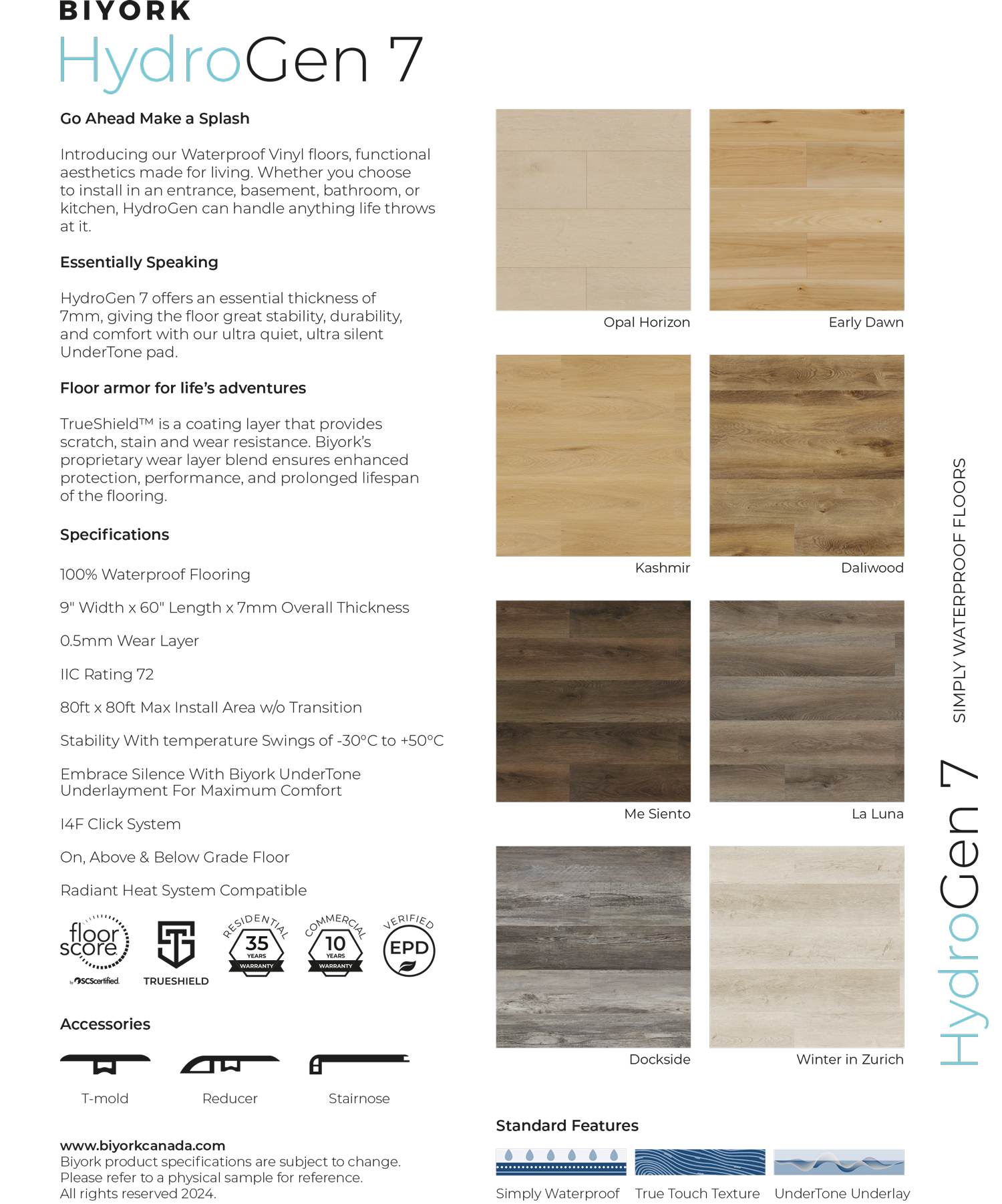 HydroGen 7 is the latest addition and flagship to the HydroGen Lineup where Waterproof is literally at its core offering an essential thickness of 7mm, giving the floor great stability, durability and comfort using Biyork’s ultra quiet UnderTone™ pad.