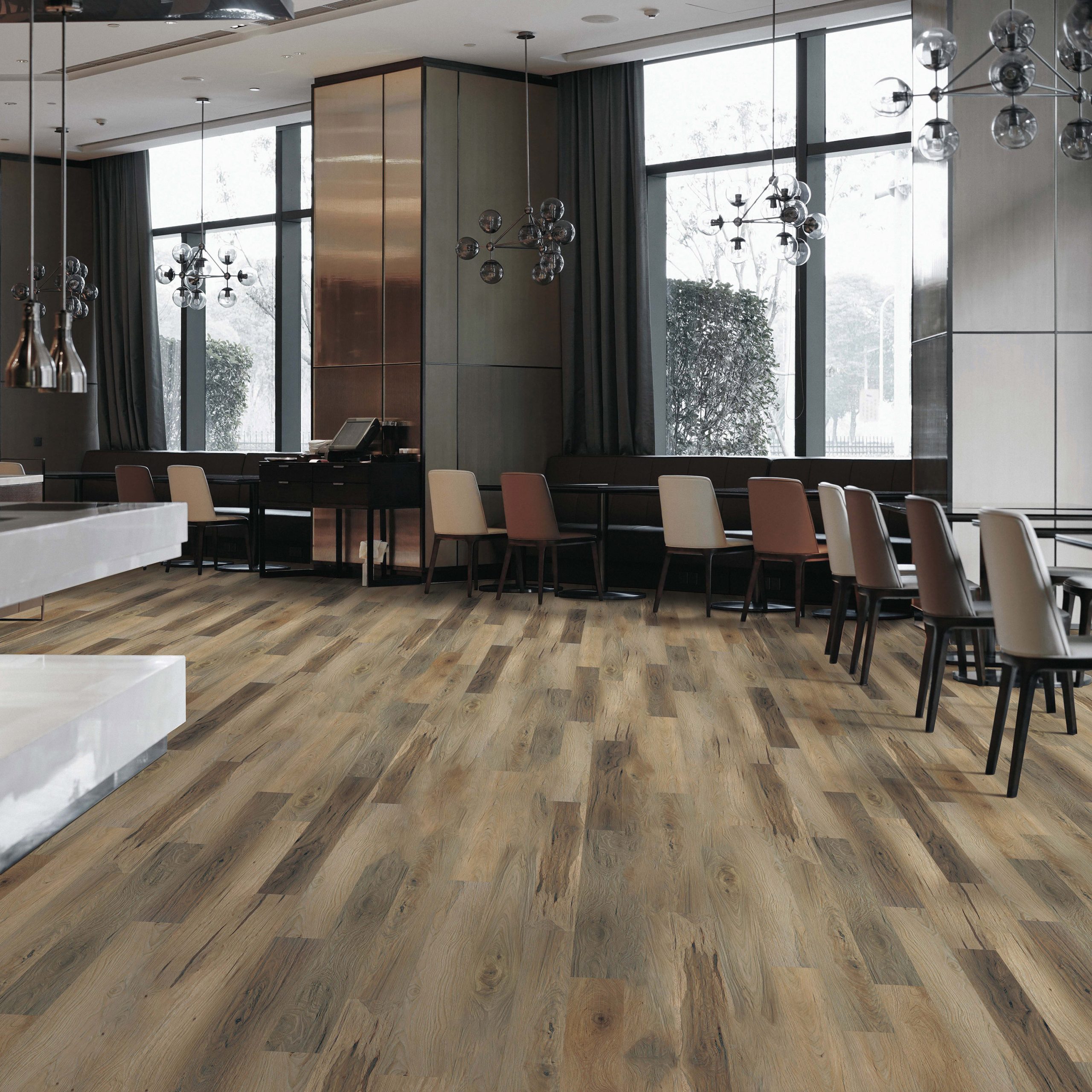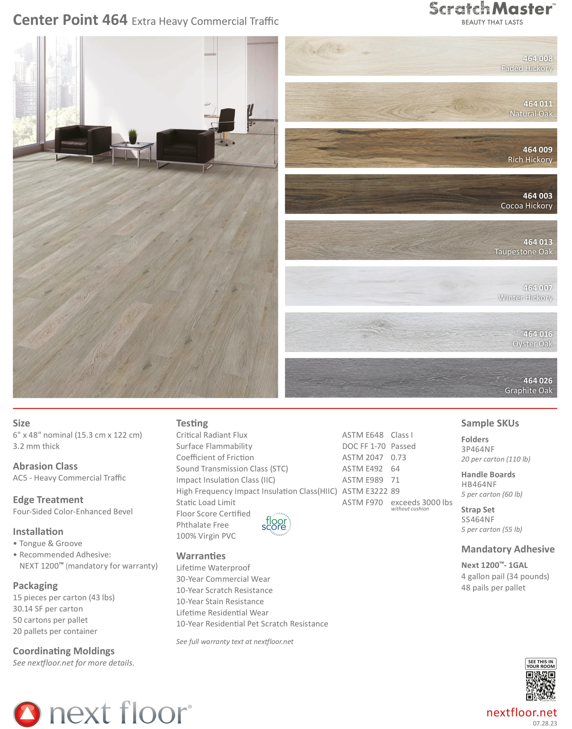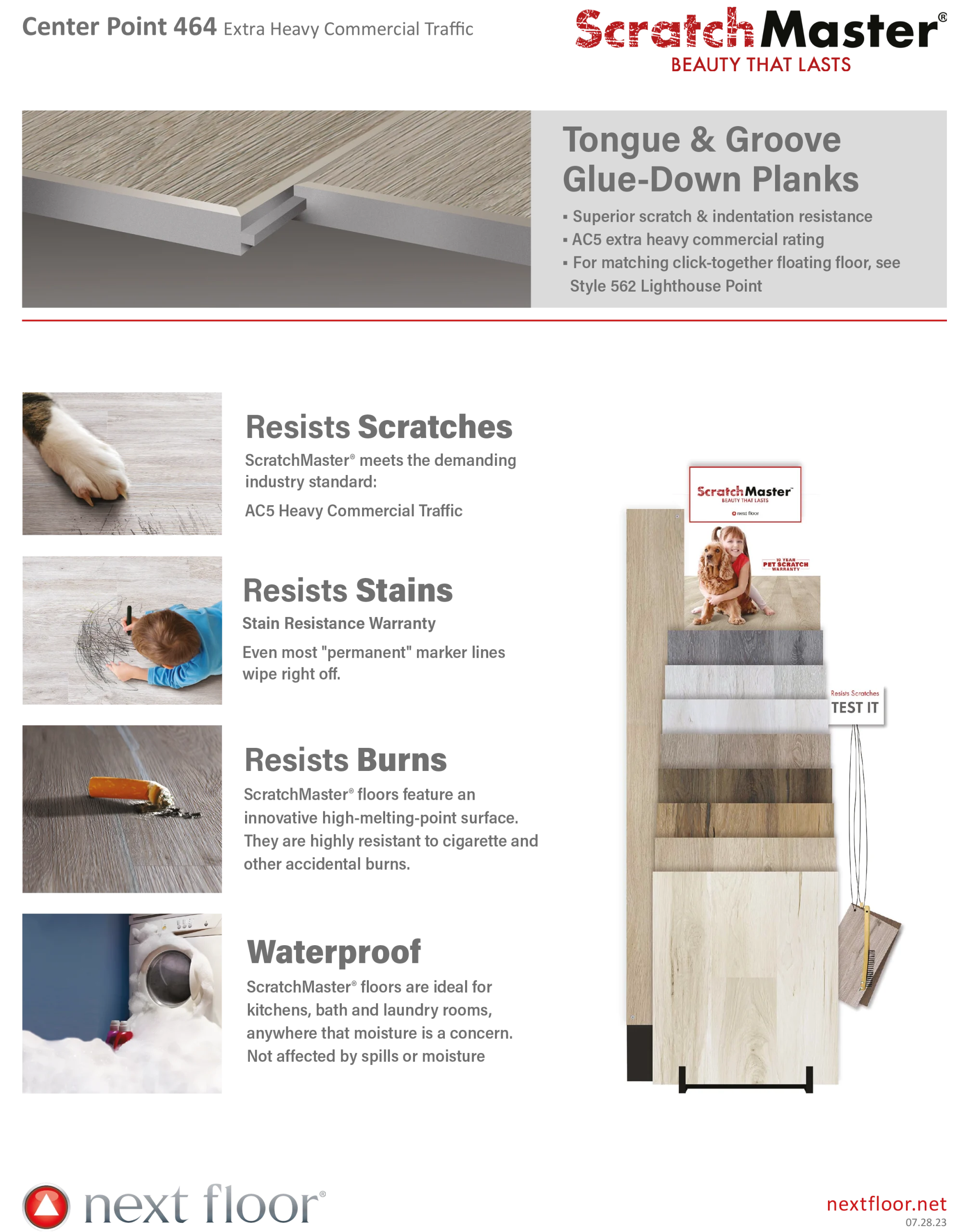 Next Floor ScratchMaster- Center Point 464. This flooring is no ordinary rigid LVT. Sliding furniture, actives families, high traffic areas, or pets are no match for ScratchMasters. Backed by a 10-year residential scratch resistance and pet scratch resistance warranty ScratchMaster provides an advance polymer surface making it highly scratch resistance. Its waterproof not affected by spills or moisture. Stain resistance, scuff resistance, and features an innovative high-melting-point surface making highly resistance to accidental burns. Comes with a 1mm attached cushion for extra comfort and noise reduction. Offered in a variety of colors call us today and let us help you find your perfect flooring.