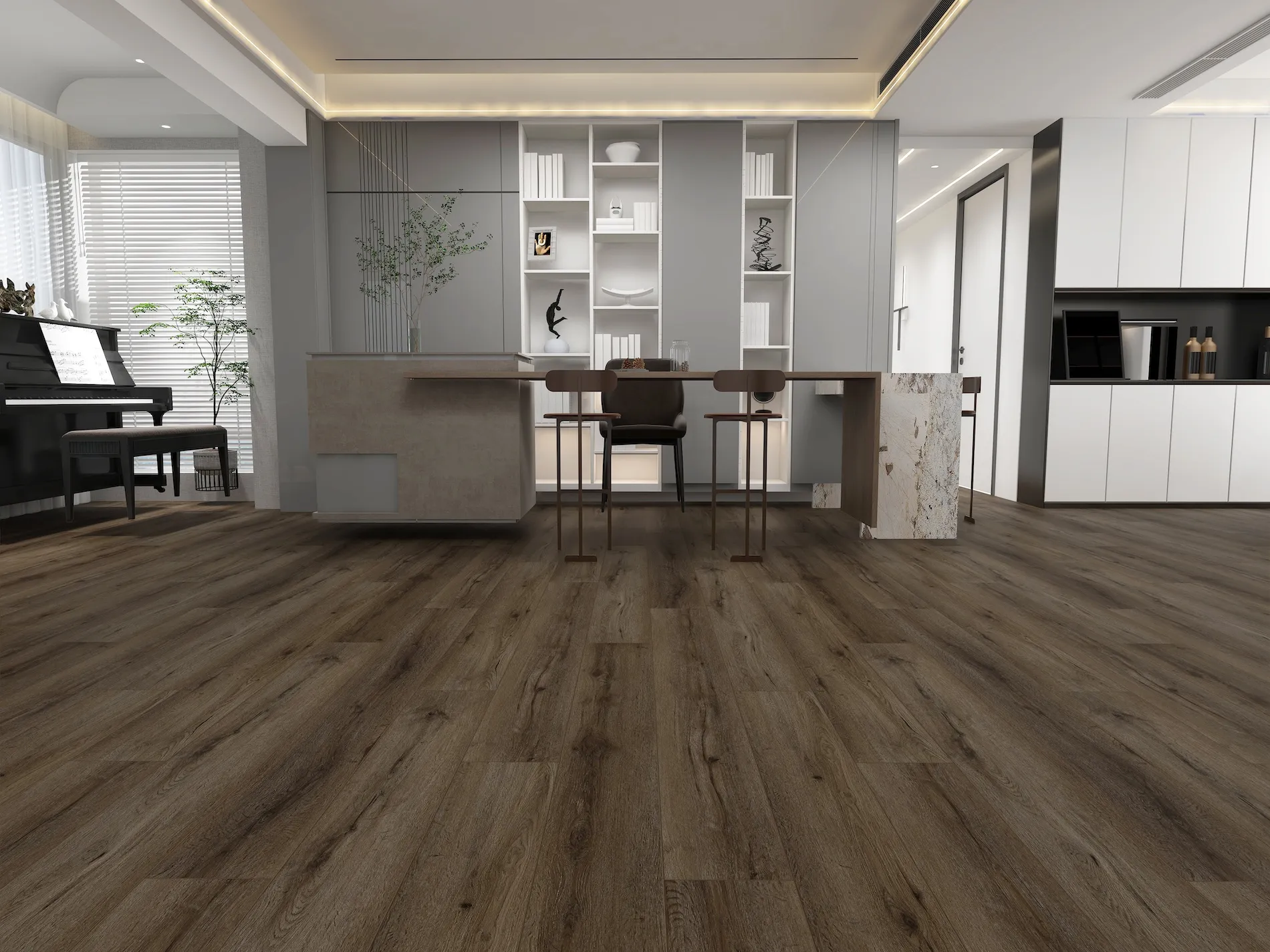 Structure: Engineered luxury vinyl plank (1.5mm LVT + 4.5mm WPC + 1mm IXPE)