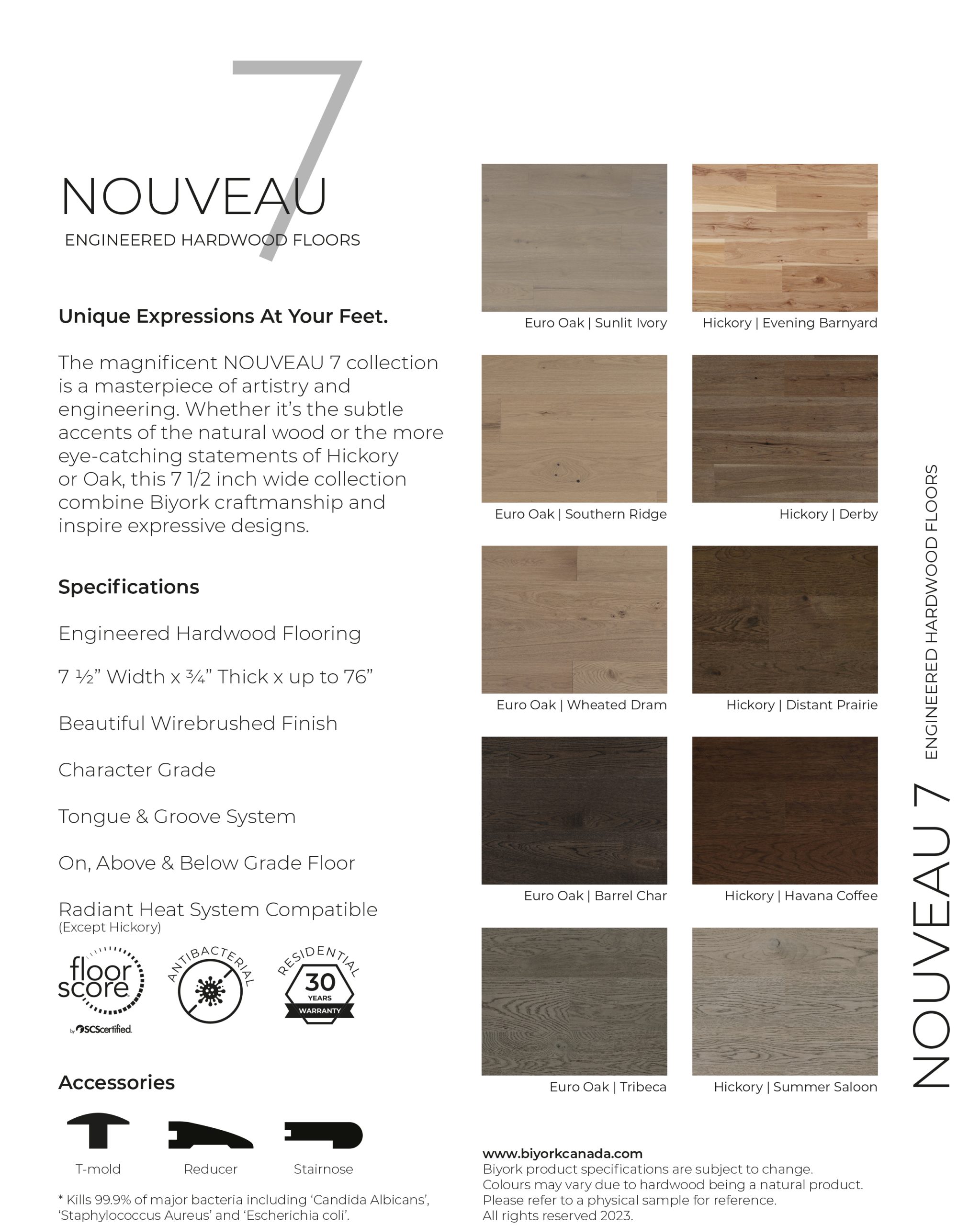 The magnificent NOUVEAU 7 collection is a masterpiece of artistry and engineering. Whether it’s the subtle accents of the natural wood or the more eye-catching statements of Hickory or Oak, this 7 1/2 inch wide collection combine Biyork craftmanship and inspire expressive designs.