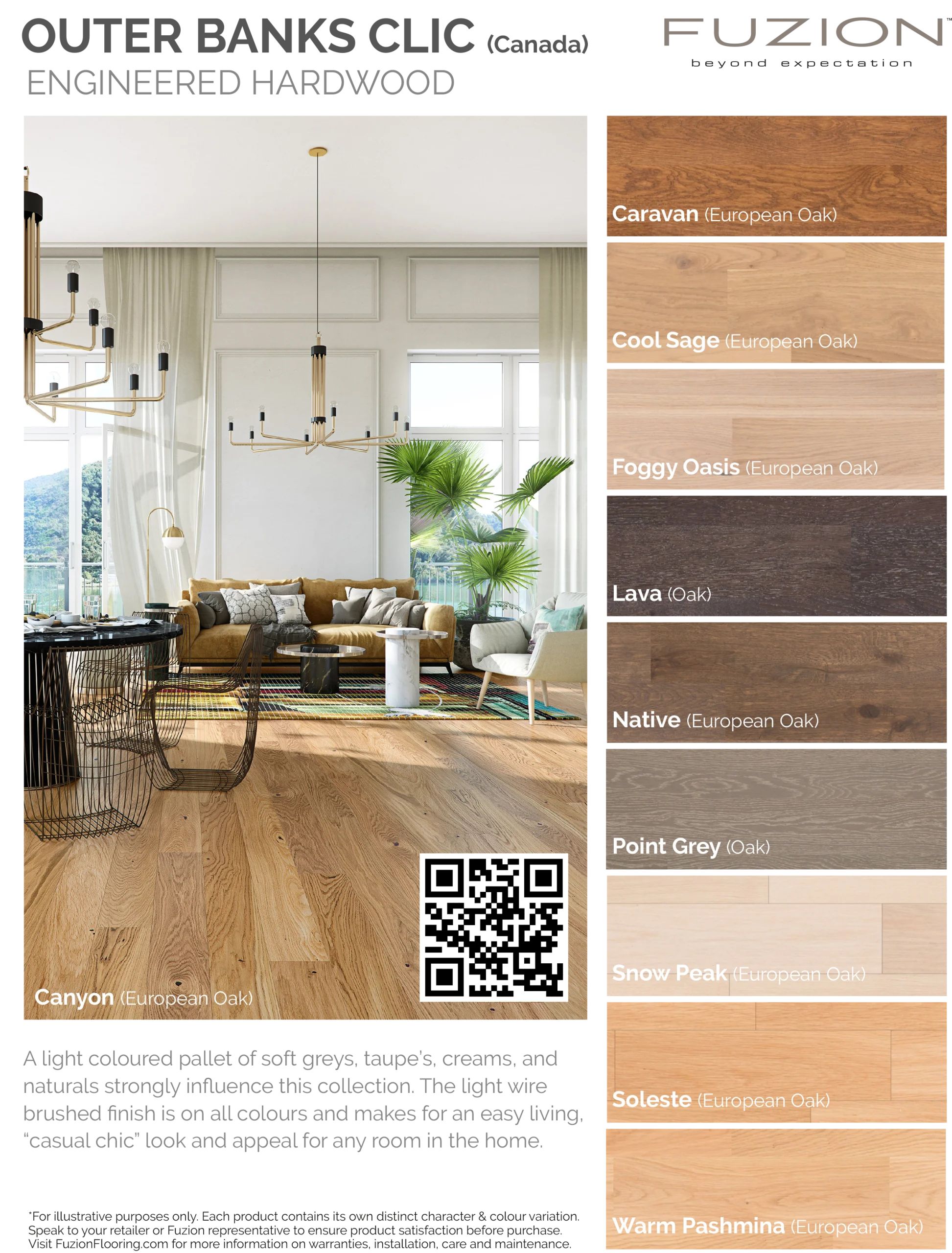 A light coloured pallet of soft greys, taupe’s, creams, and naturals strongly influence this collection. The light wire brushed finish is on all colours and makes for an easy living, “casual chic” look and appeal for any room in the home.